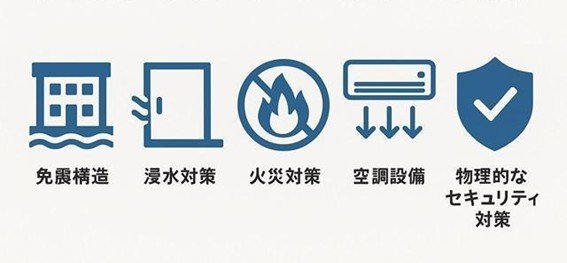 立地では、地震や水害などの災害リスクが低く、交通の利便性に優れ、通信インフラへのアクセスが良好な場所を選ぶことで、事業継続性とシステムの安定稼働を実現できます。加えて、自社拠点との適度な距離を確保することで、災害時のリスク分散につながります。