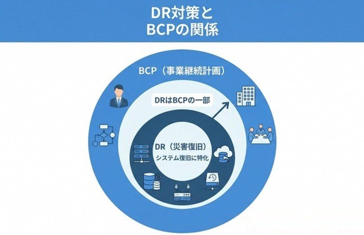 DR対策とBCPはどちらも事業継続のための取り組みですが、対象範囲が異なります。BCPが企業全体の事業継続を視野に入れた包括的な計画であるのに対し、DR対策はその中でも特にITシステムとデータの復旧に特化した対策です。まずは両者の関係性と位置づけを整理します。