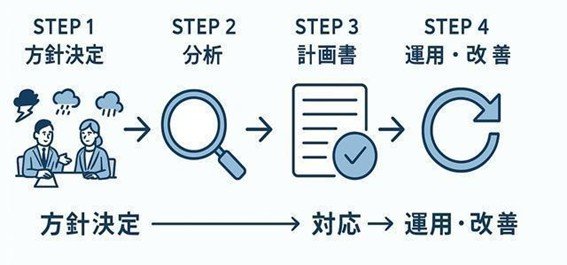 BCPを実効性のあるものにするためには、方針決定から現状分析、計画書の整備、マニュアル化、運用改善までを段階的に進める必要があります。体系的な手順に沿って検討を進めることが重要です。